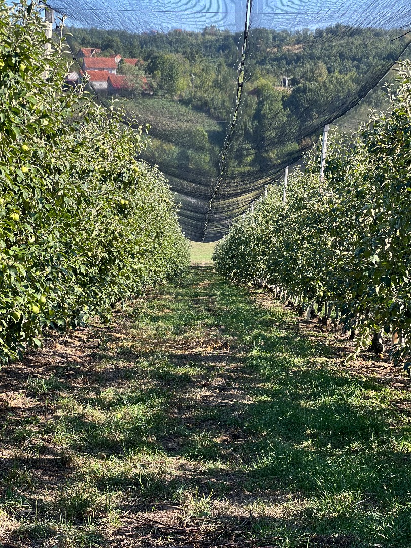 calibre 7+. Origen: Serbia Central (finca agrícola registrada). Cosecha: 2025, excelente calidad, manzanas sanas, calibre uniforme. Actualmente envasadas en cajas de madera (de dos o tres filas con papel), posibilidad de reenvasado en cajas de 10-12 kg a petición del cliente. Sistema de goteo + red antigranizo, huerto con 4.500 árboles. Cantidad total este año: 80.000 kg (de los cuales quedan 60.000 kg). Documentación: fitosanitaria.
